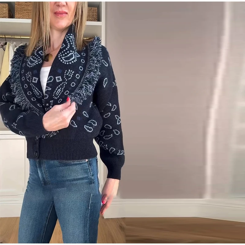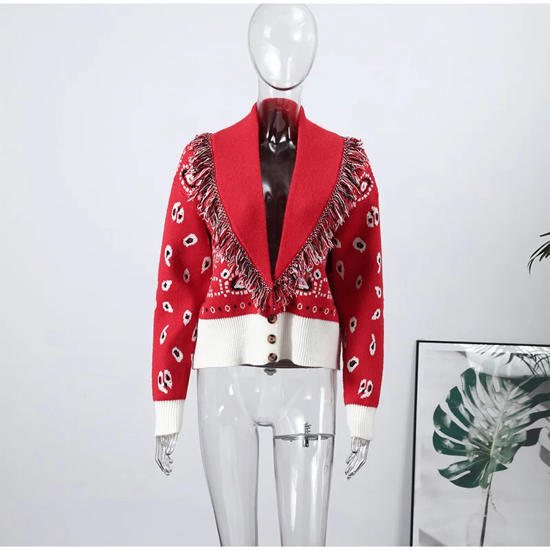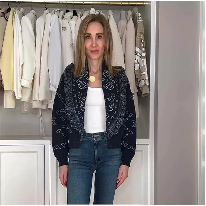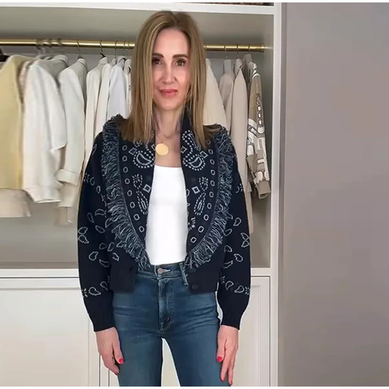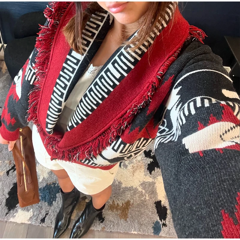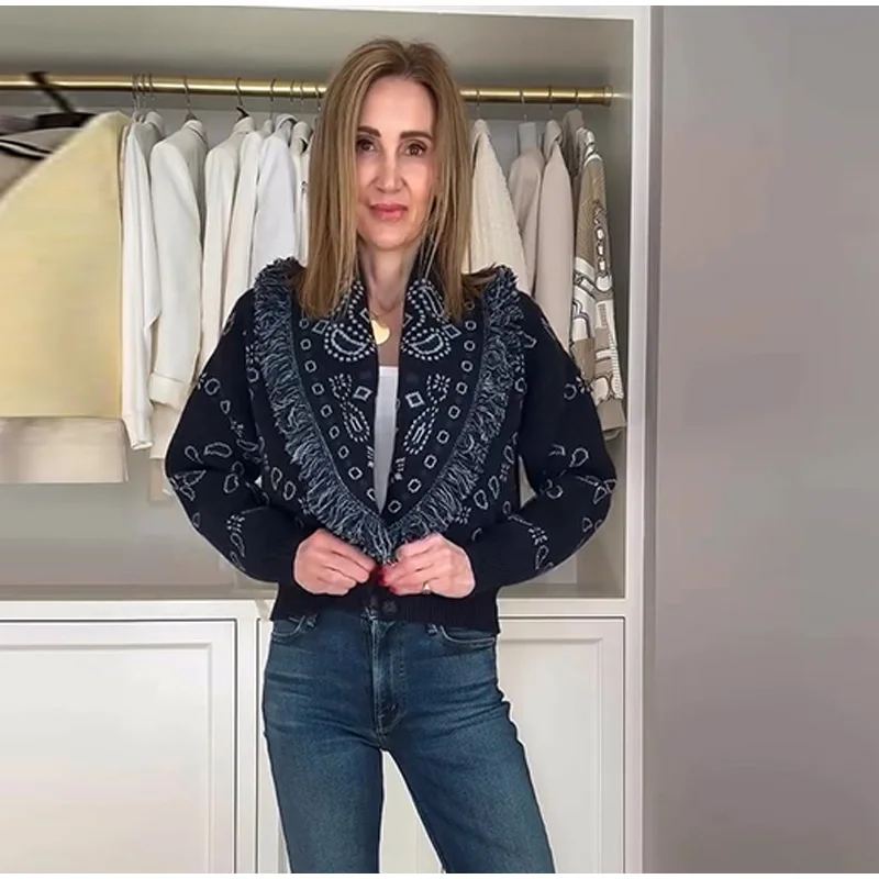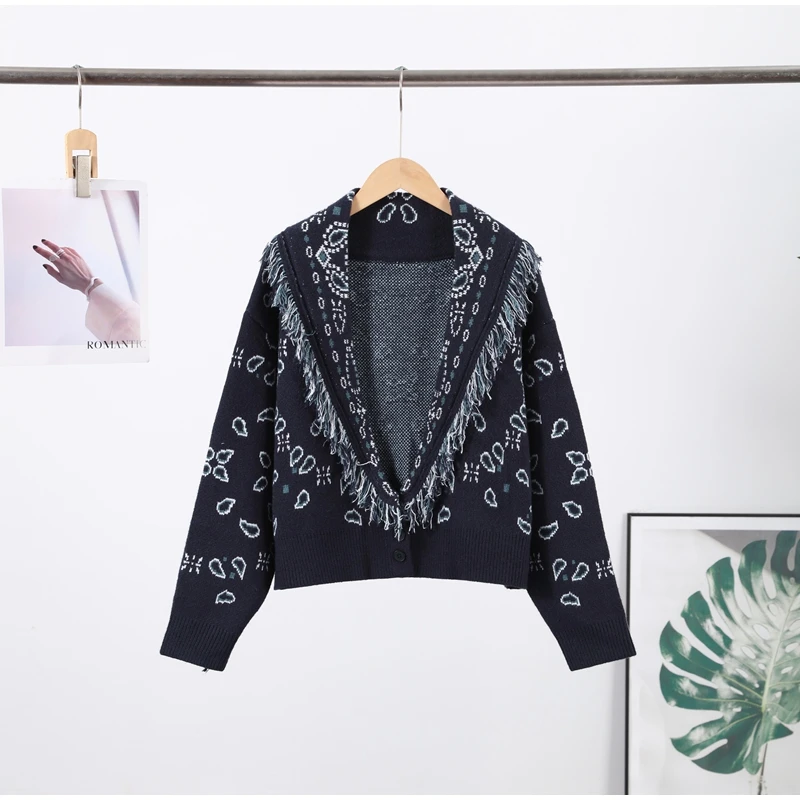 Tassel Patchwork Printed Cardigan Women Turn-down Collar Long Sleeve Knitted Fashion