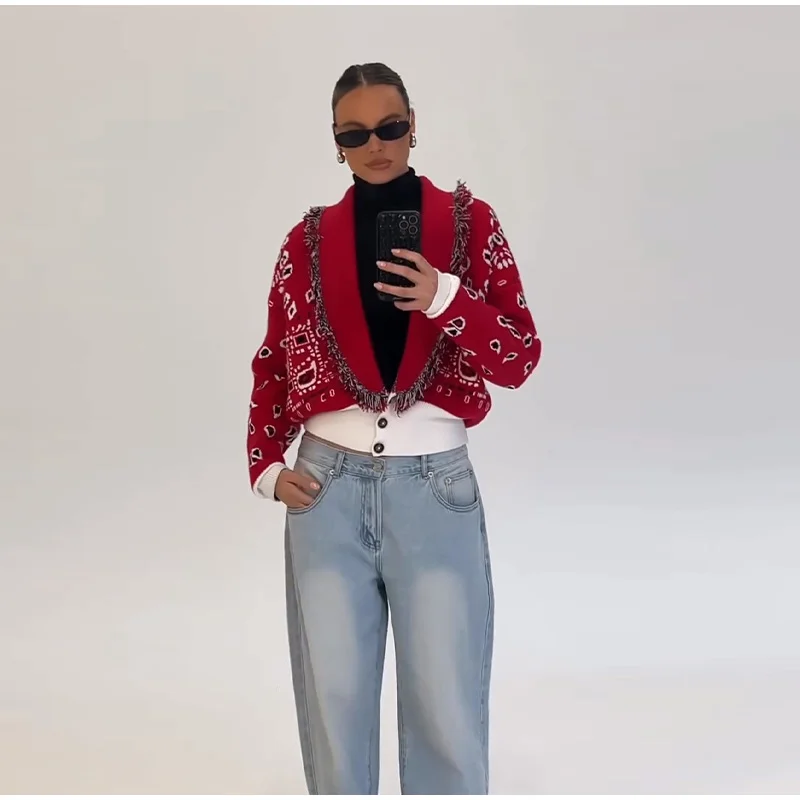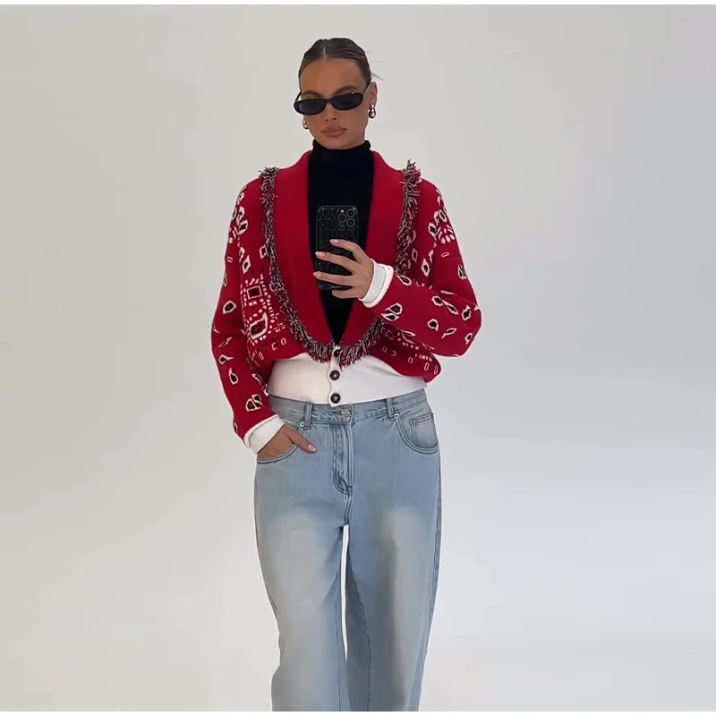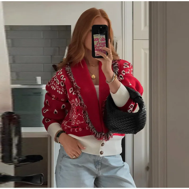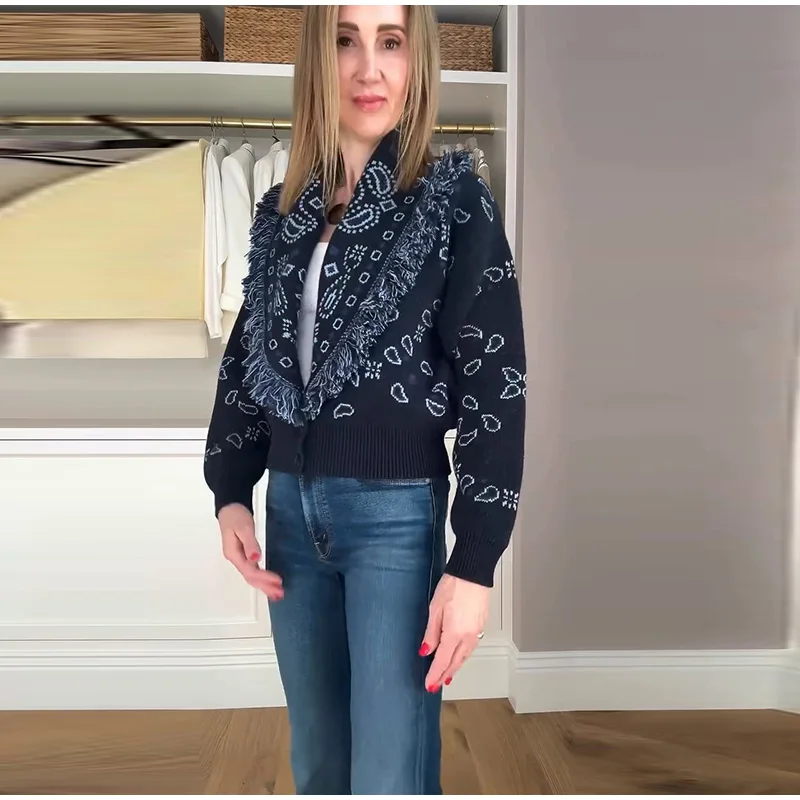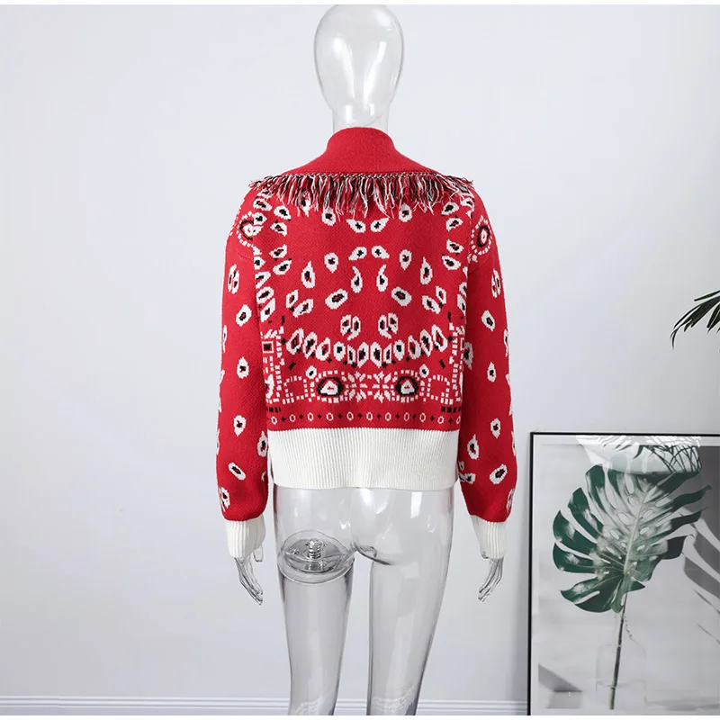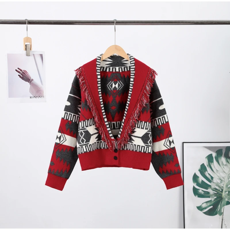 Tassel Patchwork Printed Cardigan Women Turn-down Collar Long Sleeve Knitted Fashion