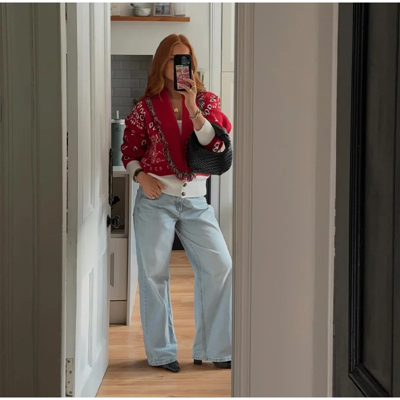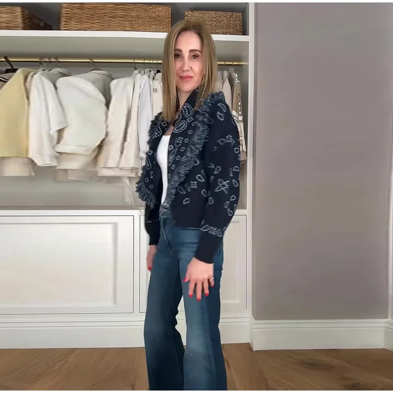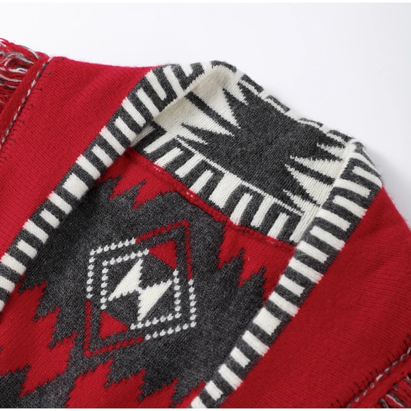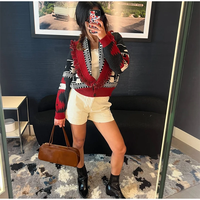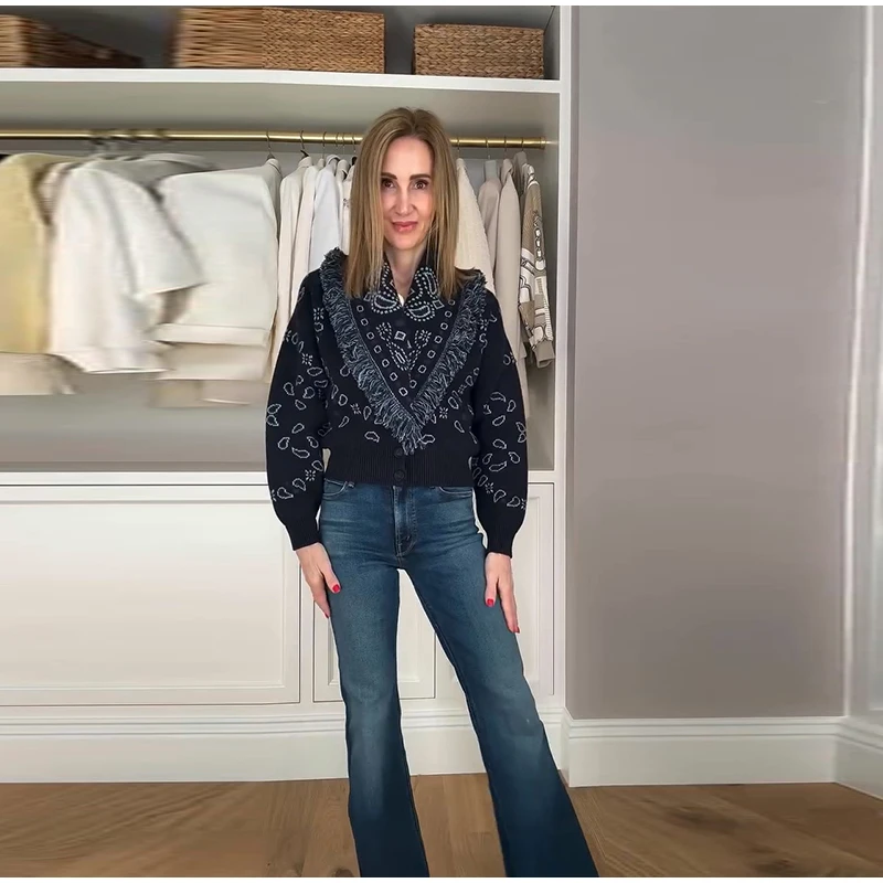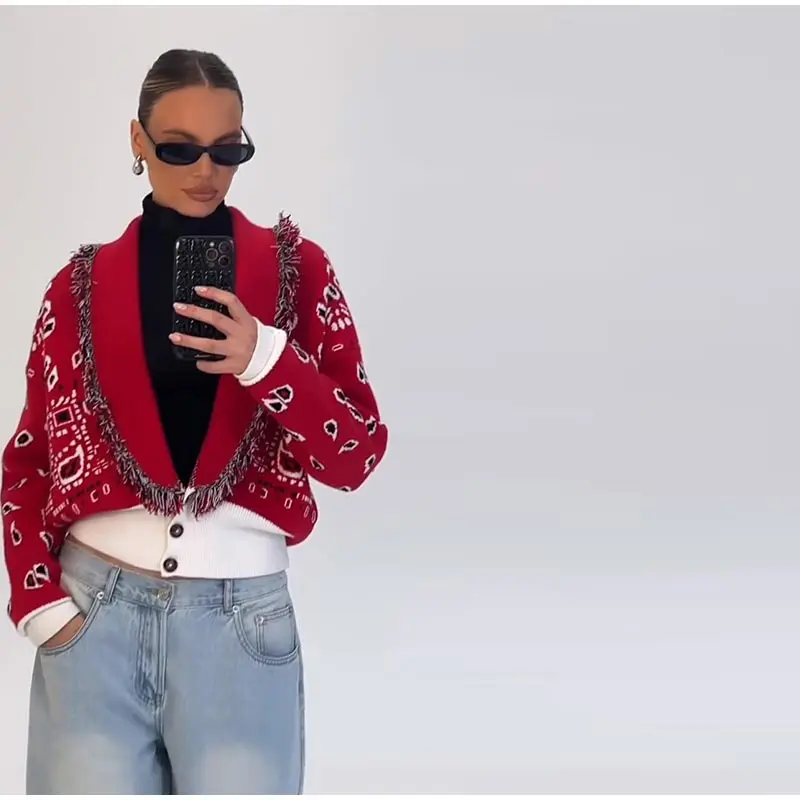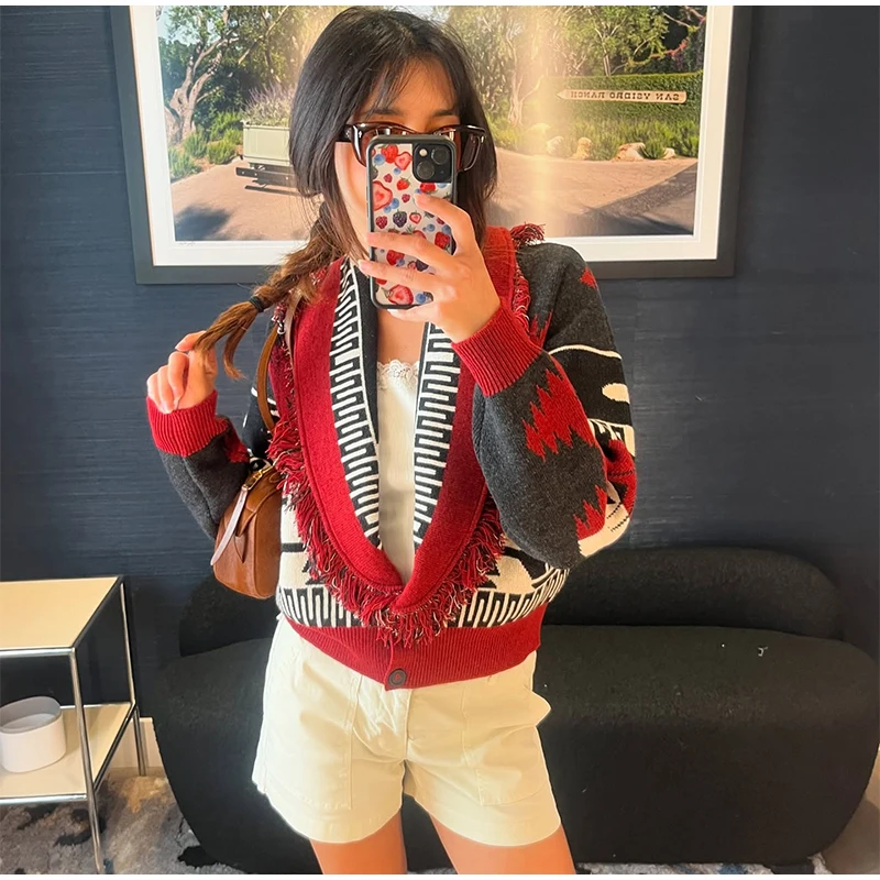 Tassel Patchwork Printed Cardigan Women Turn-down Collar Long Sleeve Knitted Fashion